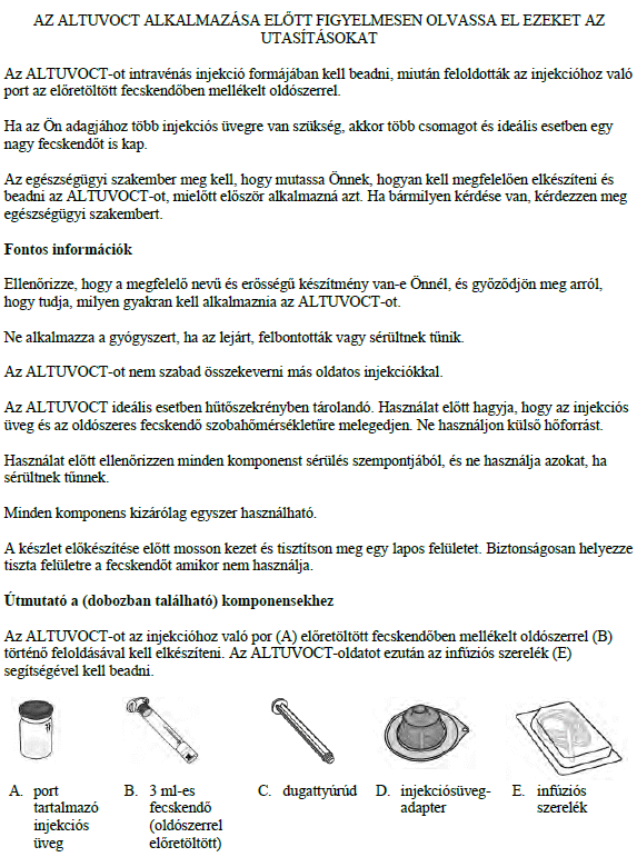 Az ALTUVOCT minden csomagja a következőket tartalmazza: 1 db port tartalmazó injekciós üveg, 3 ml oldószer előretöltött fecskendőben, 1 db dugattyúrúd, 1 db injekciósüveg-adapter és 1 db infúziós szerelék.
