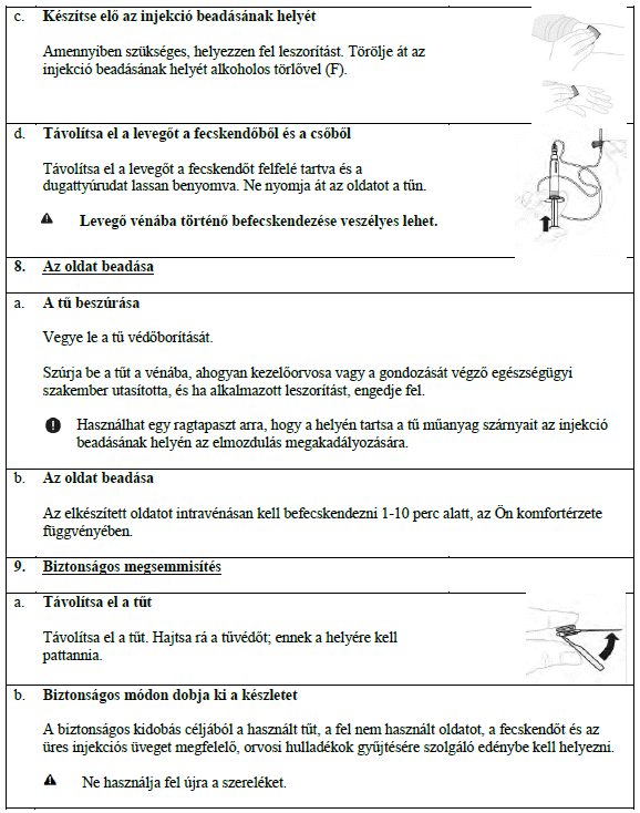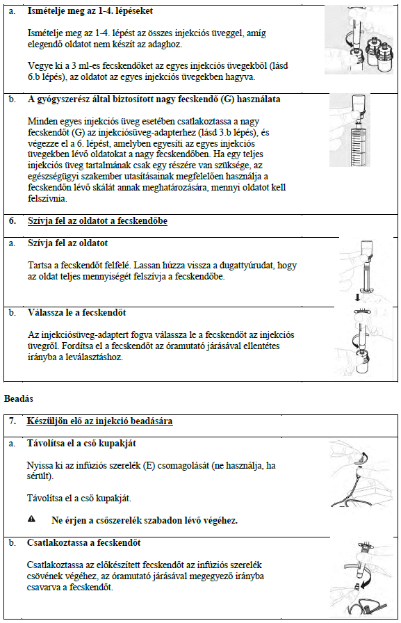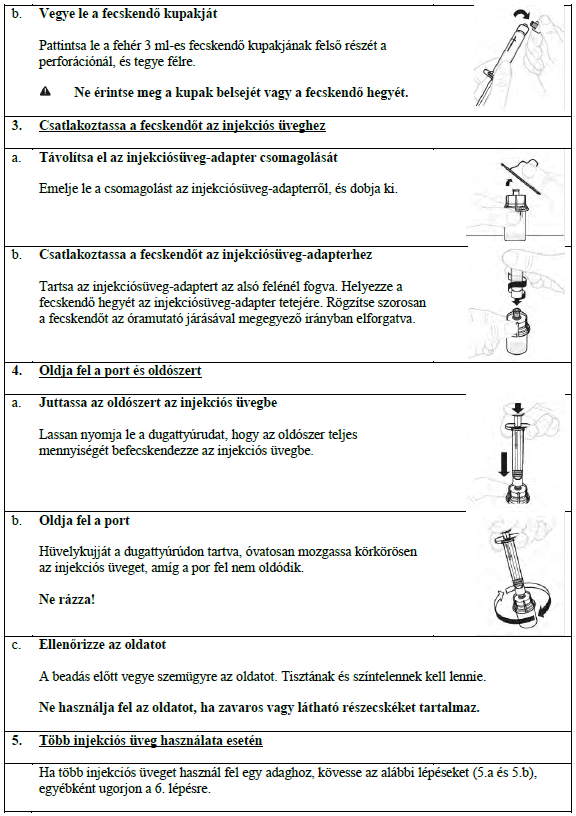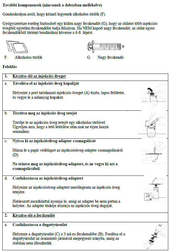 A feloldás után az oldatnak tisztának és színtelennek vagy enyhén opálosnak kell lennie. Ne alkalmazza ezt a gyógyszert, ha zavaros vagy látható részecskéket tartalmaz.