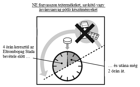 Ne vegye be az Eltrombopag Stada-t tejterméket tartalmazó ételekkel vagy italokkal, mivel a tejtermékekben lévő kalcium befolyásolja a gyógyszer felszívódását. További információért lásd a 3. pontot, "Mikor kell bevenni?".
