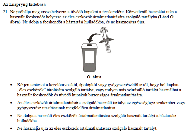 - A bontatlan külső dobozban tárolt Enspryng a hűtőszekrényből kivehető és 30 °C alatt egyszer, legfeljebb 8 napig kint tárolható. Ne tegye vissza az Enspryng-et a hűtőszekrénybe.