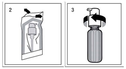 A pumpás adagolót vegye ki a műanyag zacskóból (2.ábra) és helyezze az üvegre úgy, hogy a műanyag csövet óvatosan az üvegbe csúsztatja. Szorítsa a pumpás adagolót az üveg nyakához és addig csavarja az óramutató járásával megegyező irányba, amíg az szorosan illeszkedik (3.ábra). A pumpás adagolót az alkalmazás megkezdésekor csak egyszer kell felcsavarni, és utána már soha nem kell onnan lecsavarni.
