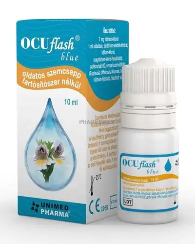 Az OCUflash blue tartósítószer-mentes szemcsepp, orvosi szemvidítófű kivonatát tartalmazó izotóniás pufferoldat. A szem kimosására, irritáció esetén nyugtatásra alkalmazható.