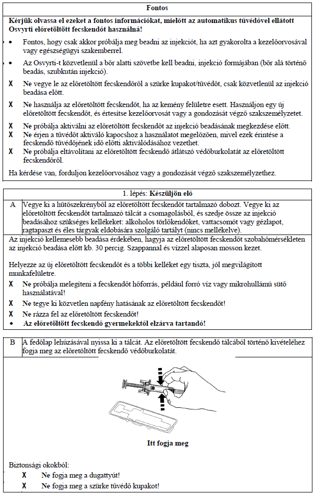 Előfordulhat, hogy kezelőorvosa úgy dönt, az a leghelyesebb, ha Ön vagy az Önt gondozó személy adja be Önnek az Osvyrti-t. Kezelőorvosa vagy egészségügyi szakember megmutatja Önnek vagy az Önt gondozó személynek, hogyan kell az Osvyrti-t alkalmazni. Az Osvyrti beadására vonatkozó útmutatásért olvassa el a betegtájékoztató végén található részt.