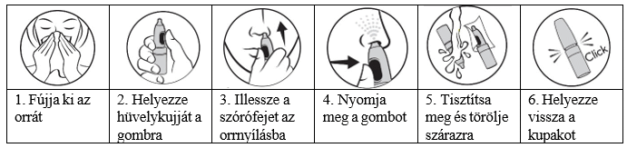 A gomb ötszöri megnyomásával töltse fel az adagoló pumpát. Normál körülmények között a feltöltést követően a pumpa a szokásos napi kezelési időszakok alatt töltve marad. Amennyiben az orrspray nem permetez, a gomb teljes megnyomásával vagy 7 napon keresztül nincs használatban az orrspray, az adagoló pumpát ismét fel kell tölteni a gomb kétszeri megnyomásával. Amennyiben nem a teljes adag spray kerül befúvásra, ne ismételje meg a befúvást.