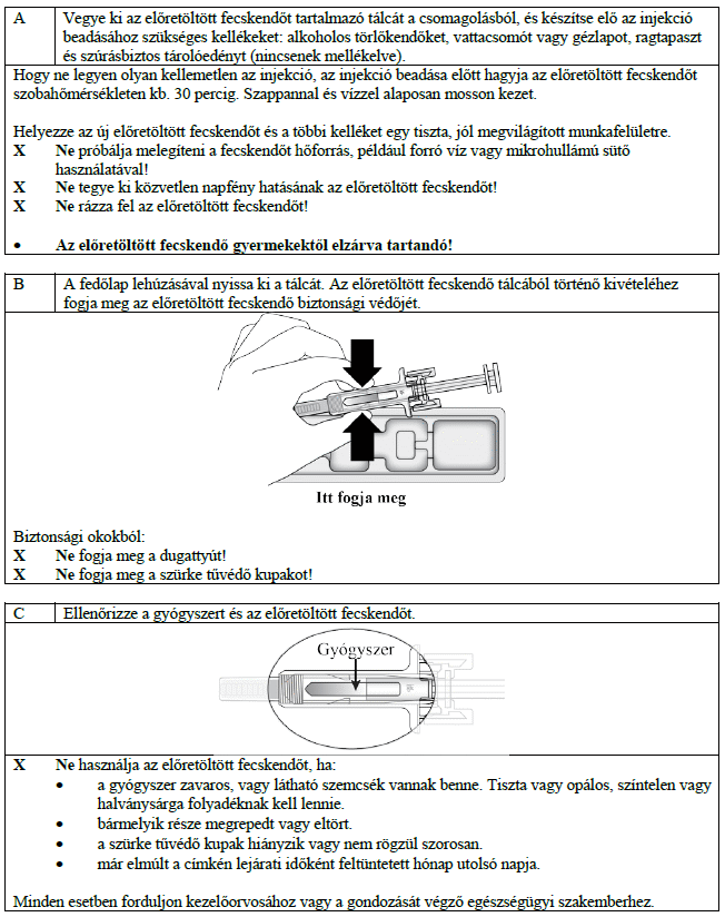 Az előretöltött fecskendőt a hűtőszekrényből kivéve hagyhatja szobahőmérsékletre (legfeljebb 30 °C-ra) melegedni a beadás előtt. Így az injekciózás kevésbé lesz kellemetlen. Ha a fecskendő egyszer szobahőmérsékletűre melegedett (legfeljebb 30 °C), akkor azt ne tegye vissza a hűtőszekrénybe és használja fel 32 napon belül.