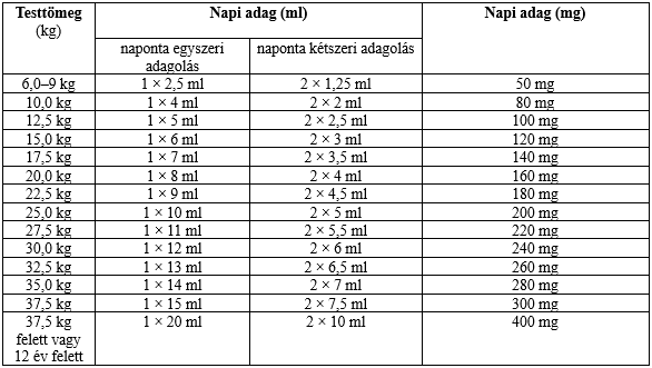 A készítmény ajánlott adagja - ha a gyermek testtömege a táblázatban feltüntetett testtömegértékek közé esik, akkor a nagyobb testtömeghez tartozó adagot kell figyelembe venni: