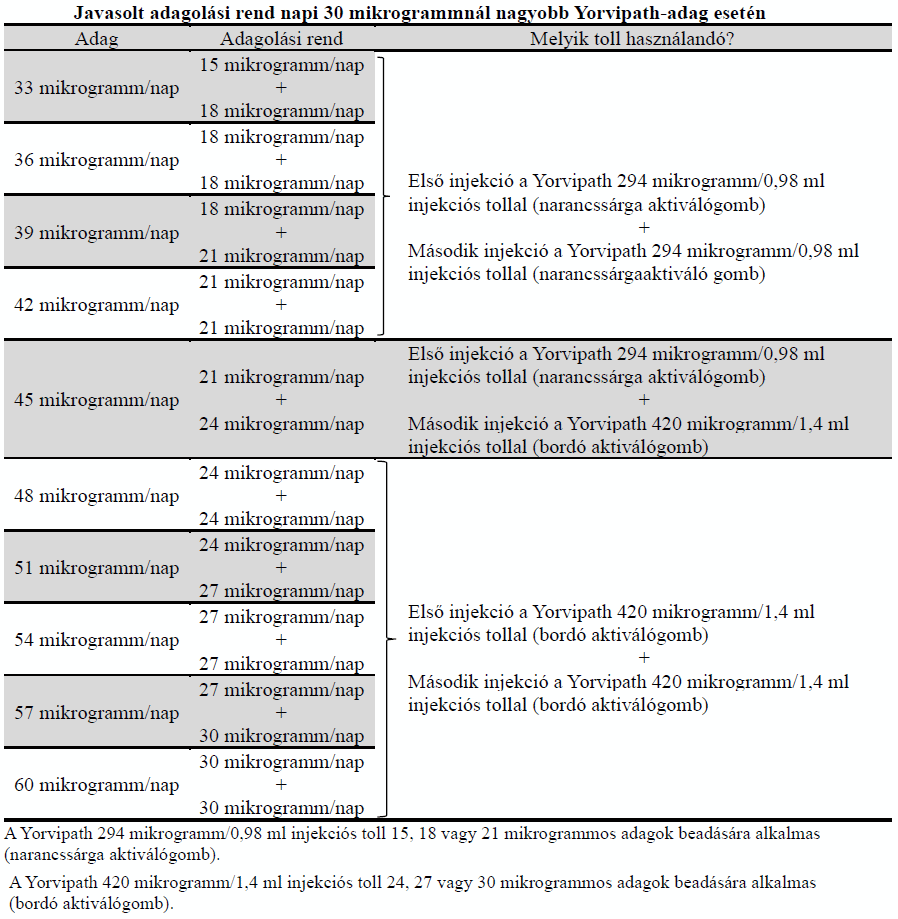 A Yorvipath javasolt kezdő adagja 18 mikrogramm naponta egyszer. Kezelőorvosa javasolhatja, hogy a gyógyszerre adott válasz alapján fokozatosan módosítson az adagon mindaddig, amíg el nem éri azt az adagot, amely normál tartományban tartja szervezete kalciumszintjét anélkül, hogy szüksége lenne aktív D-vitamin-pótlásra vagy terápiás adagban alkalmazott kalciumra. Az étrendbeli előírások miatt kezelőorvosa előírhatja, hogy továbbra is folytassa a napi szintű kalciumpótlást. Az adag csak akkor növelhető, ha legalább 7 nap eltelt a legutóbbi adagmódosítás óta. Ezzel szemben az adag túl magas kalciumszint esetén leggyakrabban 3 naponta csökkenthető.