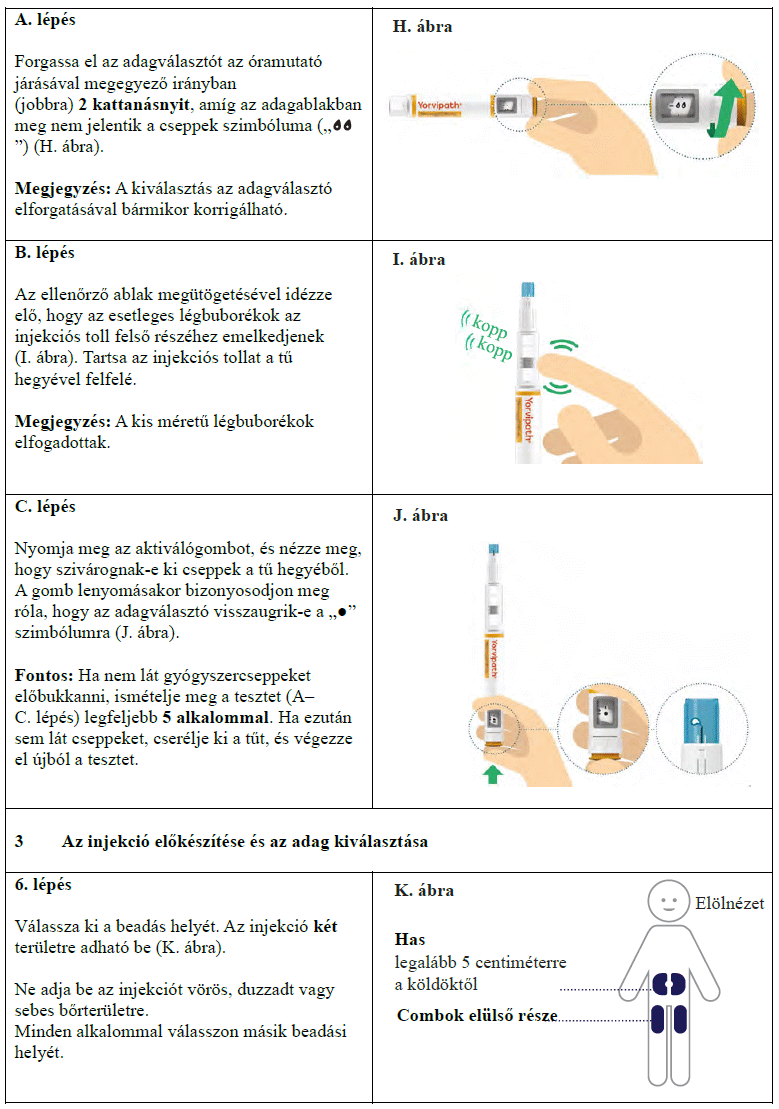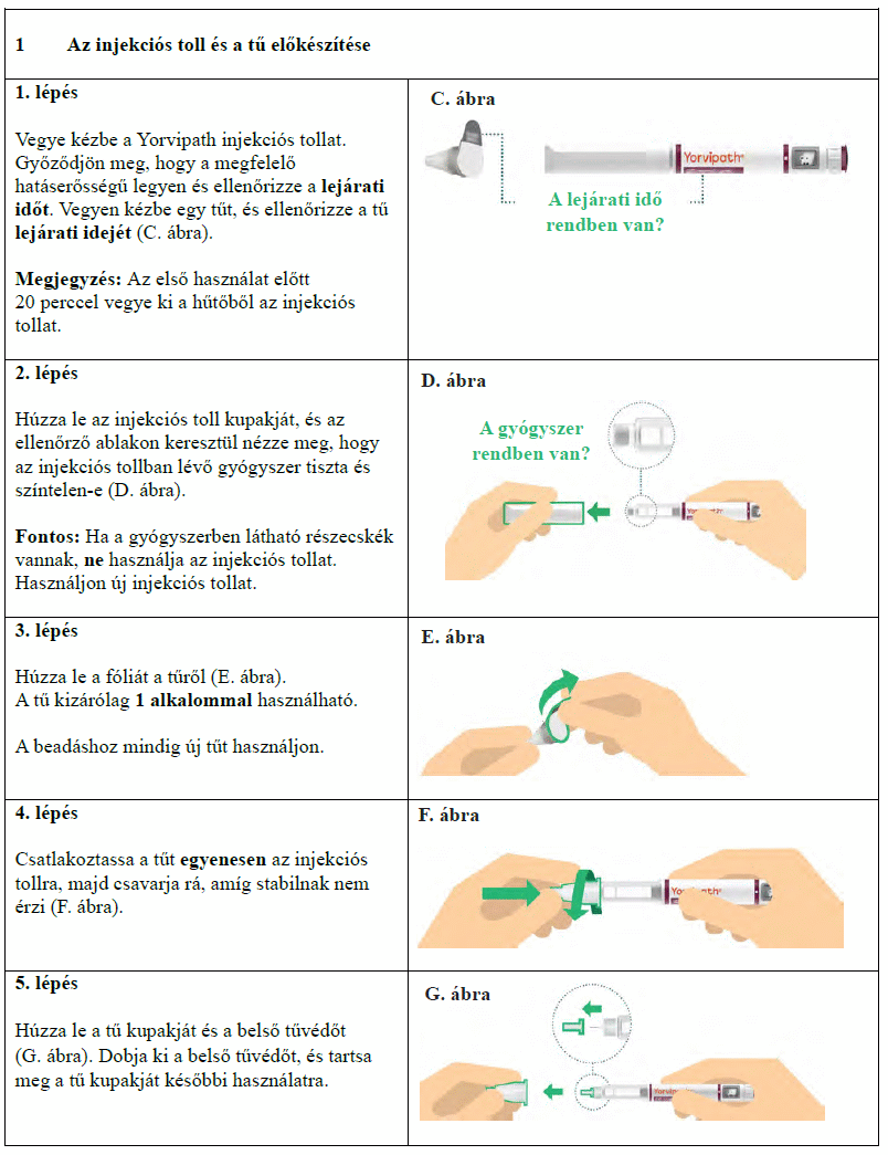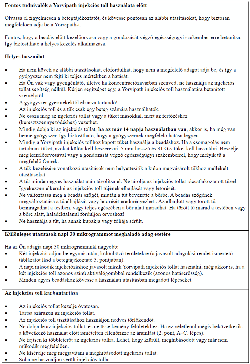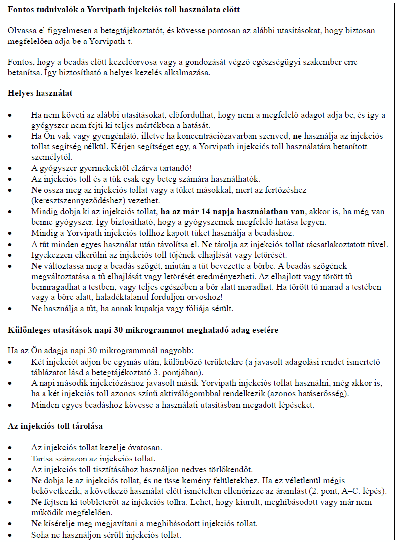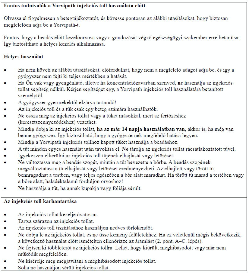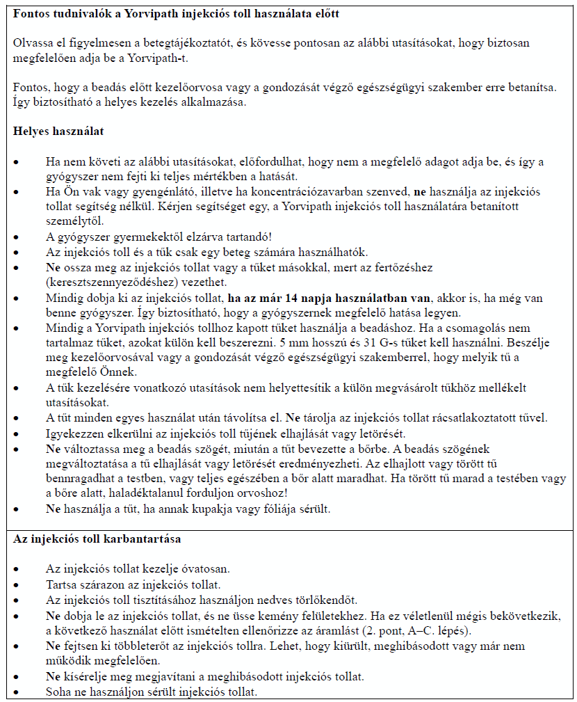 Az injekciós toll első használata előtt kezelőorvosa, gyógyszerésze vagy a gondozását végző egészségügyi szakember megmutatja, hogyan kell befecskendezni a Yorvipath-t. A Yorvipath alkalmazásával kapcsolatban további segítséget a jelen betegtájékoztató végén található használati utasítás ad.