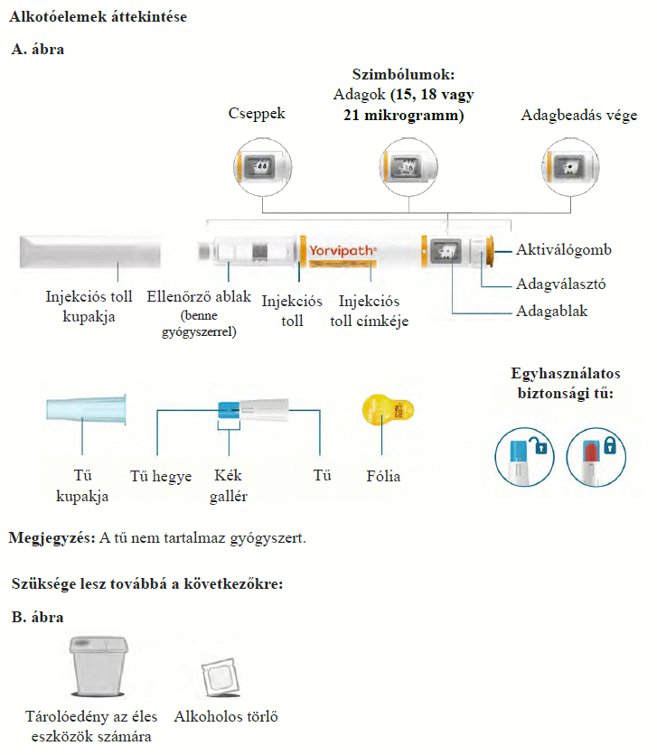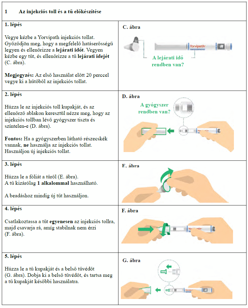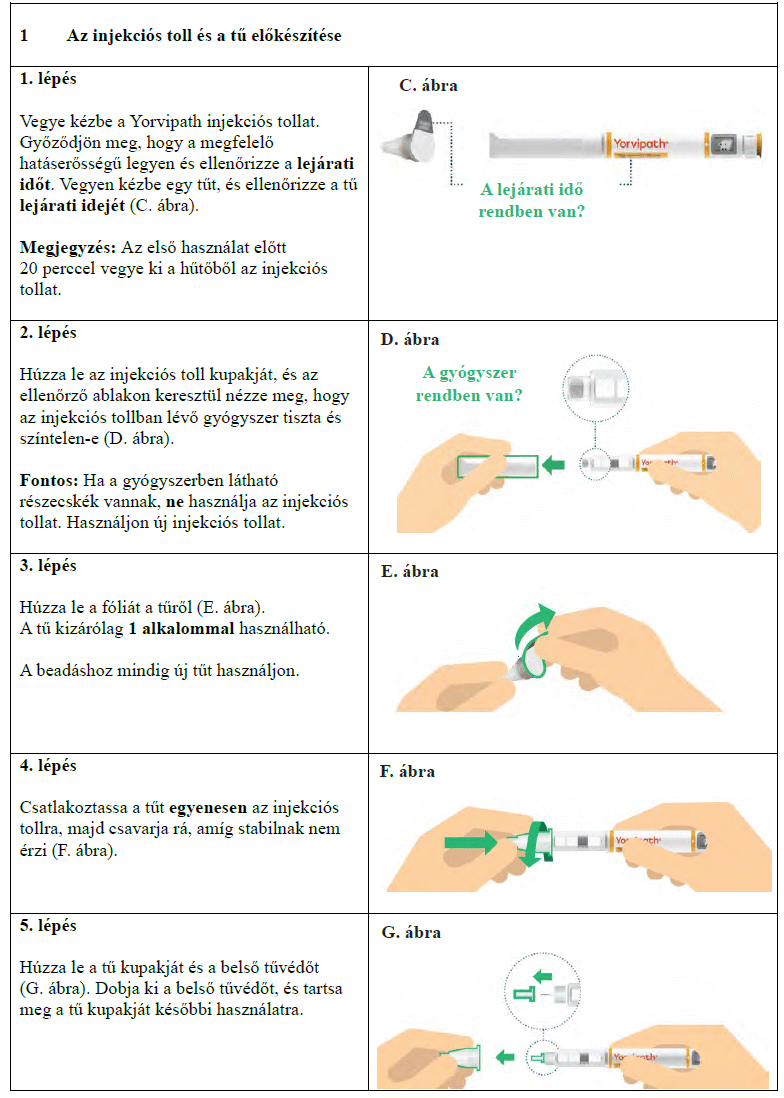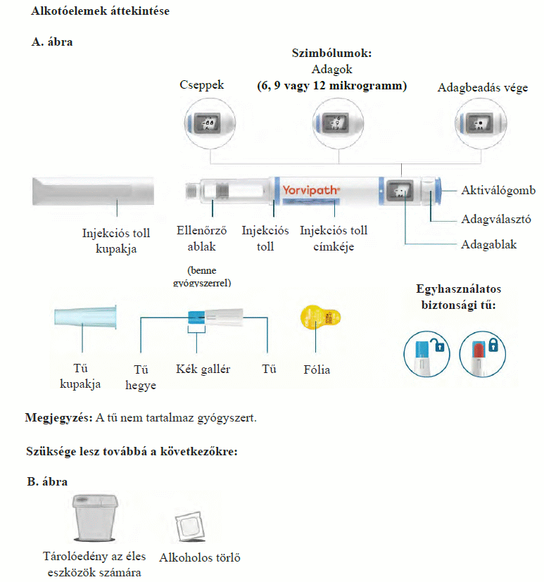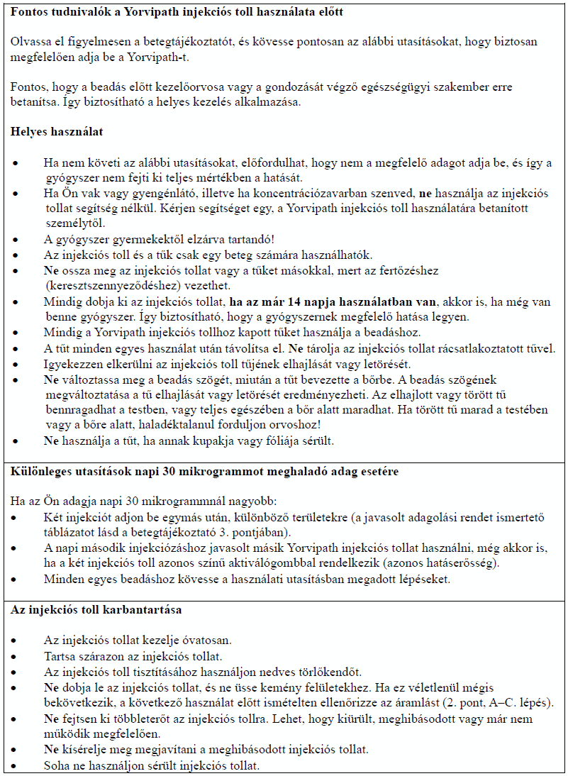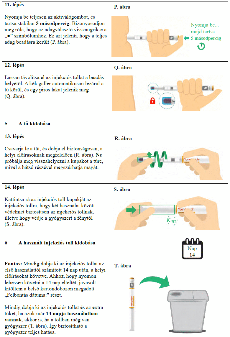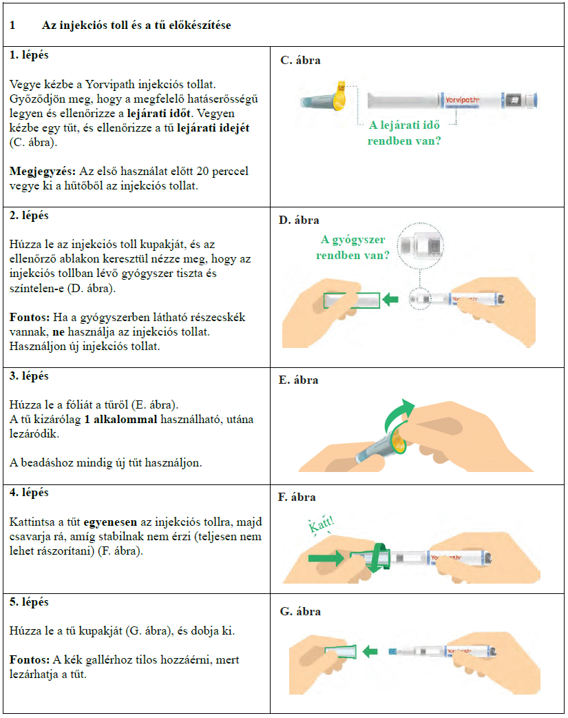 Az injekciós toll első használata előtt kezelőorvosa, gyógyszerésze vagy a gondozását végző egészségügyi szakember megmutatja, hogyan kell befecskendezni a Yorvipath-t. A Yorvipath alkalmazásával kapcsolatban további segítséget a jelen betegtájékoztató végén található használati utasítás ad.