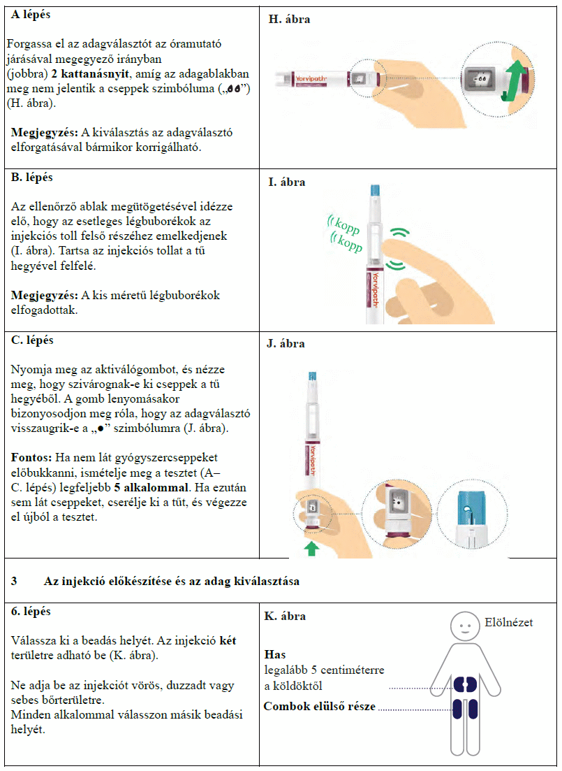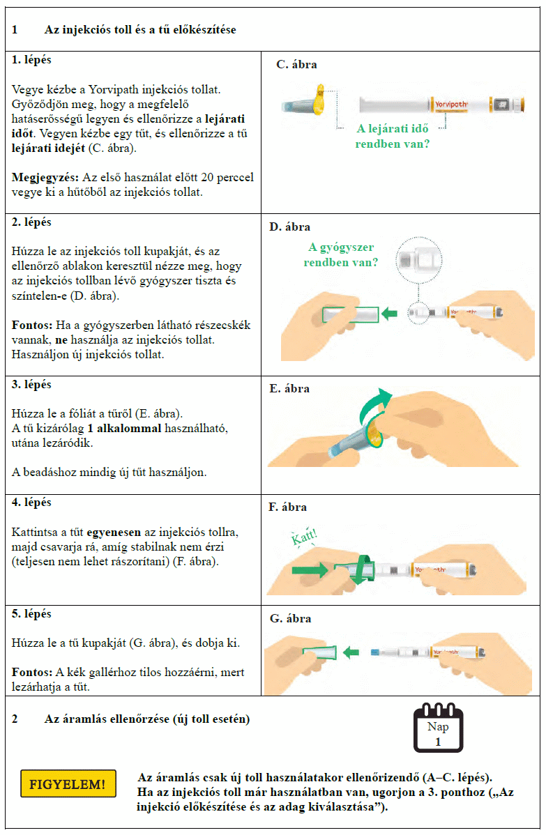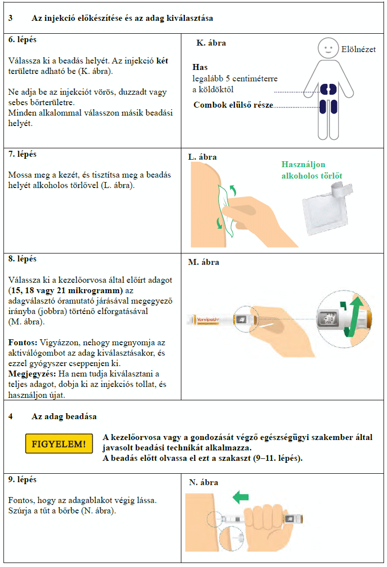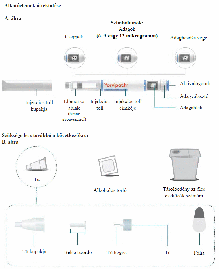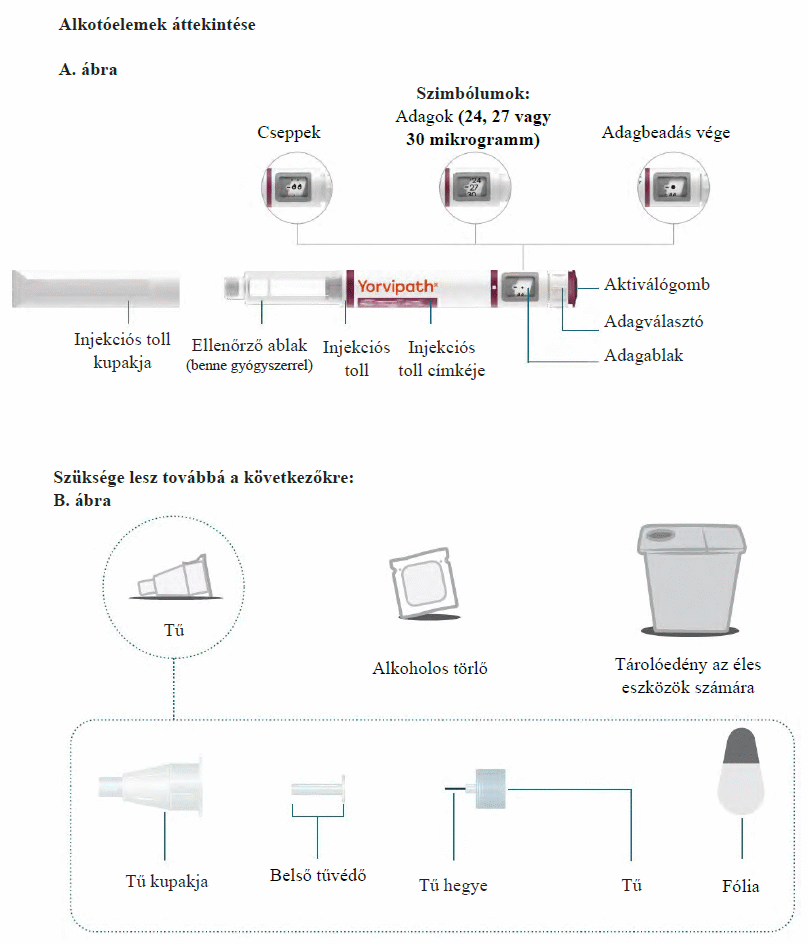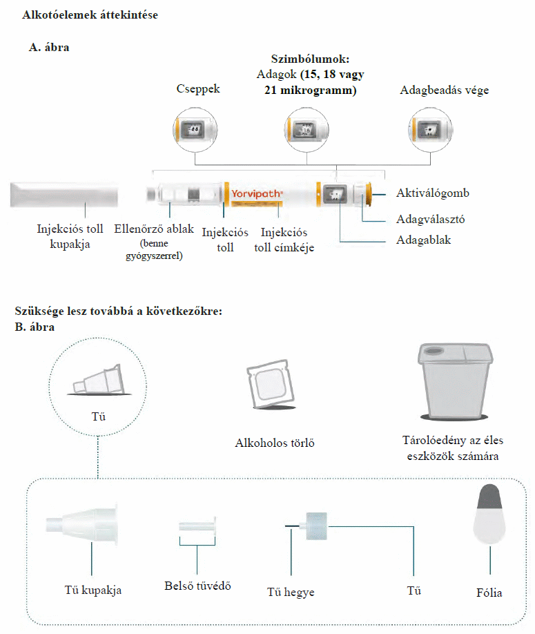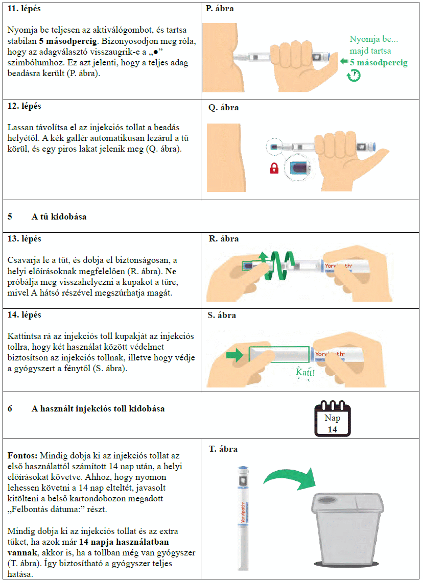 Az injekciós toll első használata előtt kezelőorvosa, gyógyszerésze vagy a gondozását végző egészségügyi szakember megmutatja, hogyan kell befecskendezni a Yorvipath-t. A Yorvipath alkalmazásával kapcsolatban további segítséget a jelen betegtájékoztató végén található használati utasítás ad.