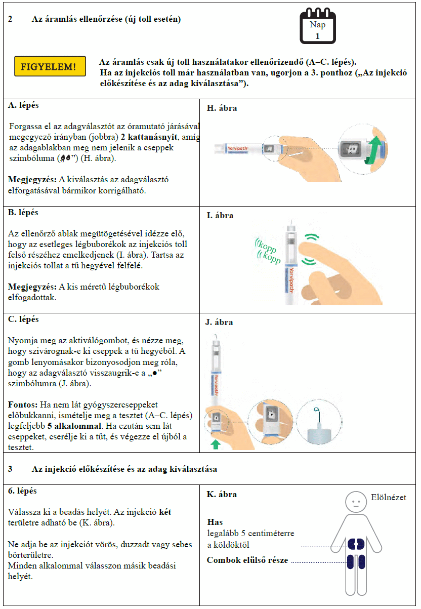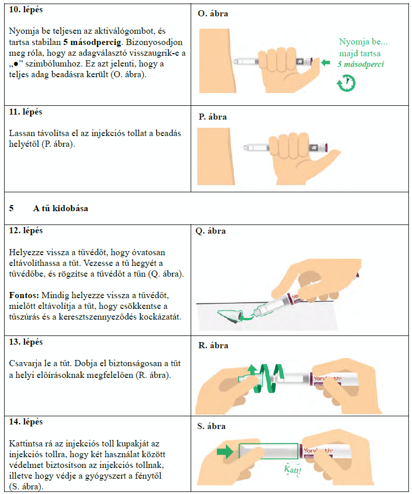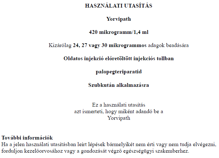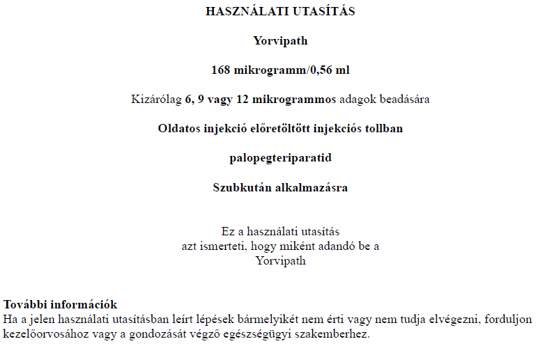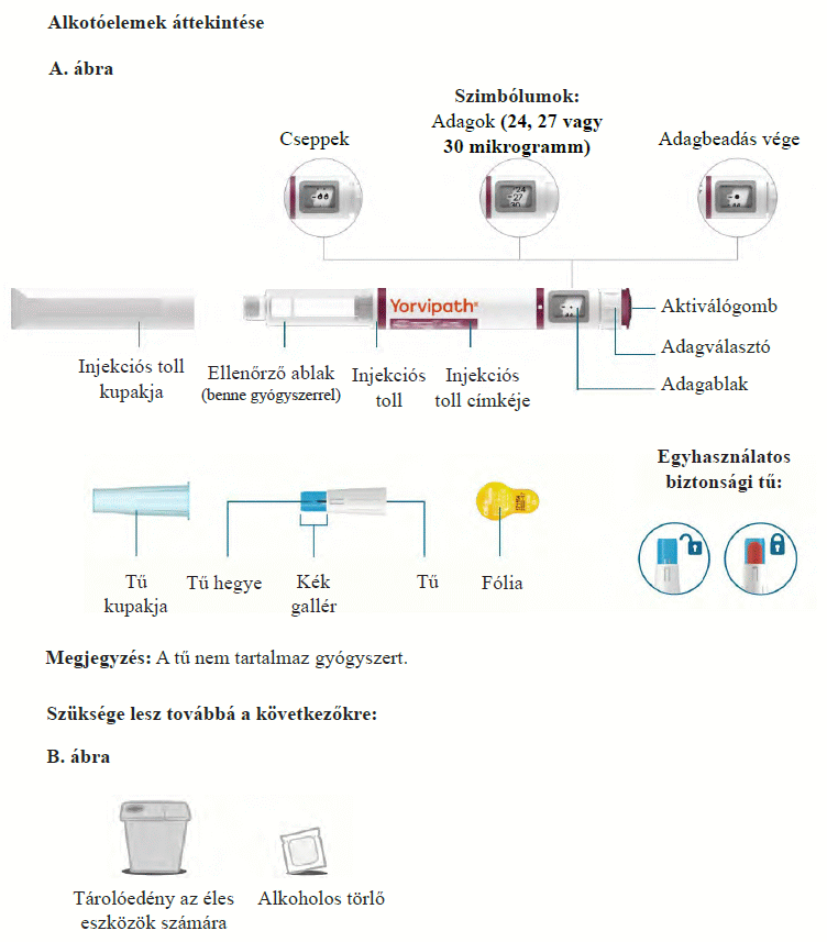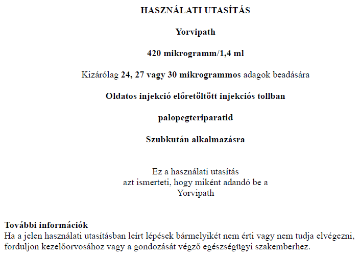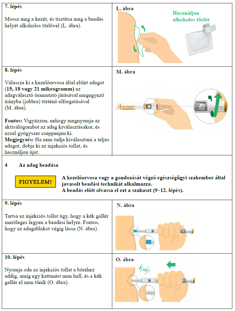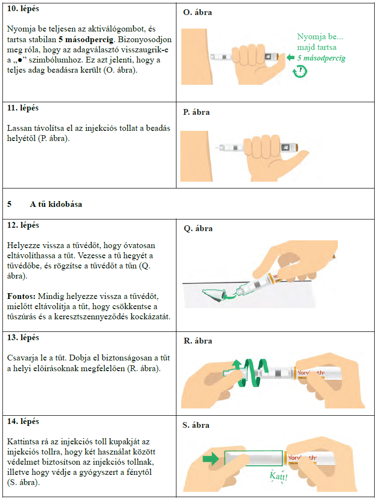 Az injekciós toll első használata előtt kezelőorvosa, gyógyszerésze vagy a gondozását végző egészségügyi szakember megmutatja, hogyan kell befecskendezni a Yorvipath-t. A Yorvipath alkalmazásával kapcsolatban további segítséget a jelen betegtájékoztató végén található használati utasítás ad.