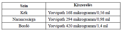 A Yorvipath szubkután injekcióhoz való oldat előretöltött injekciós tollban, mely háromféle kiszerelésben kapható: