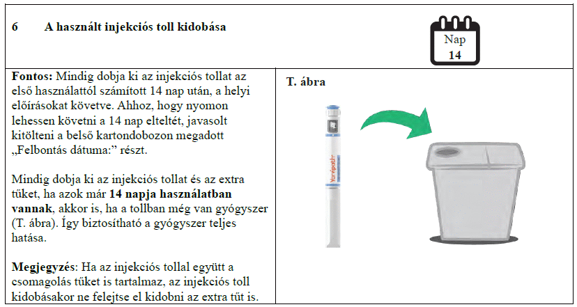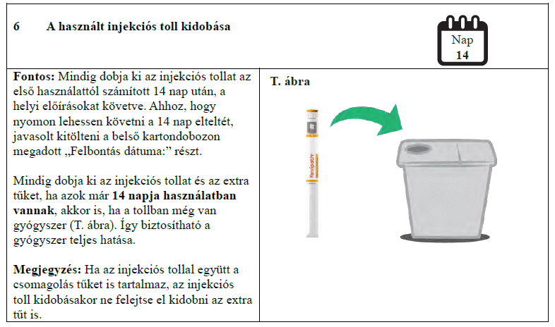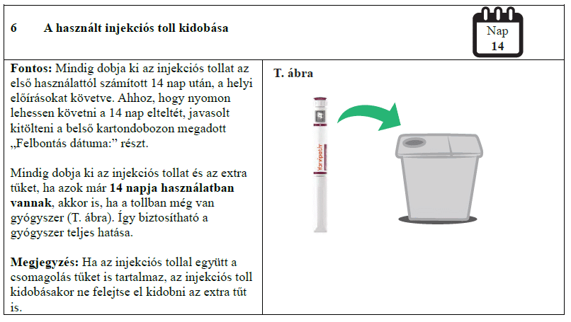 A fénytől való védelem érdekében az injekciós toll kupakját tartsa az előretöltött injekciós tollon. Az injekciós tollat az első alkalmazástól számított 14 nap után semmisítse meg.