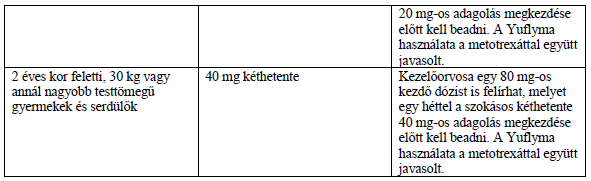 Az Ön kezelőorvosa fogja eldönteni, hogy a Yuflyma-t metotrexáttal együtt, vagy önmagában alkalmazza.